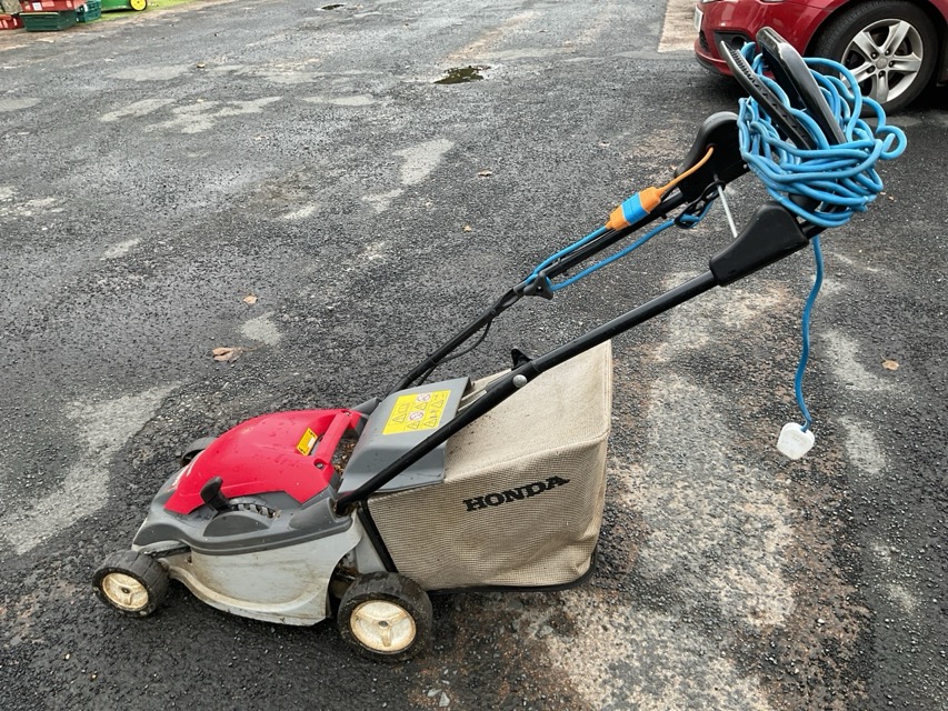 A Honda electric rotary garden mower - model HRE370, with extension cable, adjustable wheels, fabric grassbox, etc.
