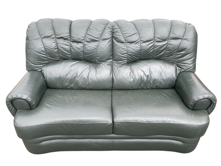 A leather upholstered two-seater sofa with rectangular back and concave seat flanked by outscrolled arms raised on disc feet. (71in)