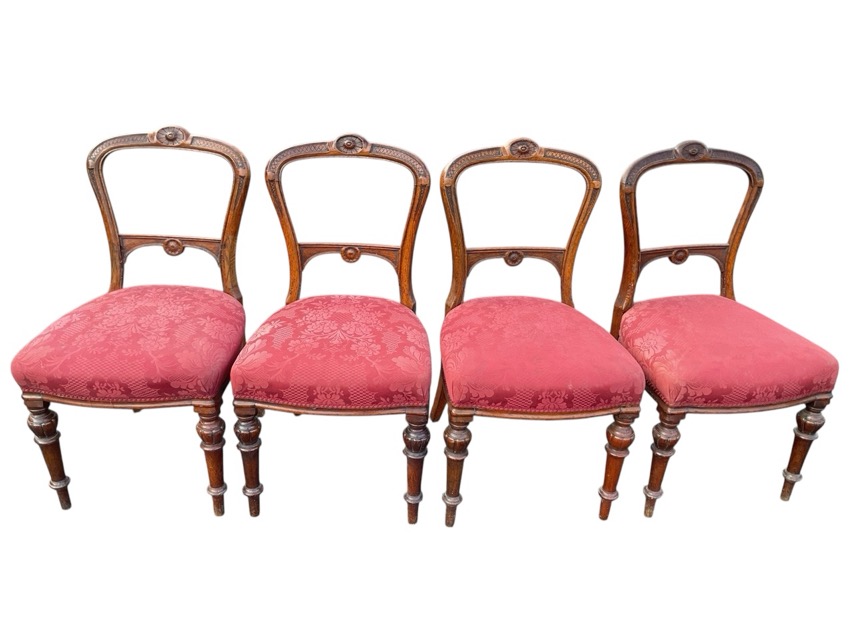 A set of four Victorian walnut dining chairs with circular and oval flowerhead medallions to back rails above stuffover upholstered seats, raised on turned tapering legs. (4)