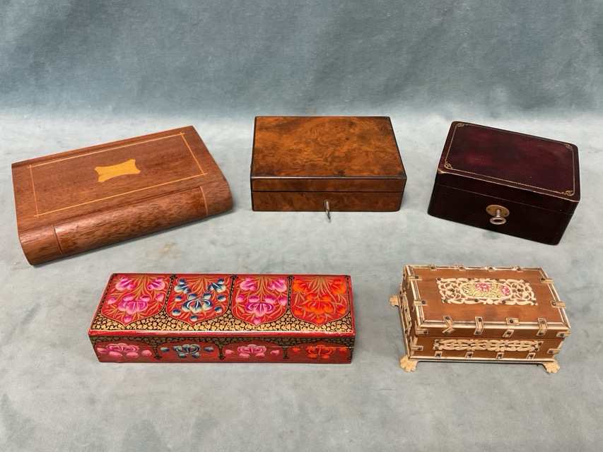 A Victorian walnut box; a European casket type box with pierced bone fretwork mounts raised on claw feet; an eastern painted lacquered box; a lined Edwardian box with gilt dotted border to cover; and a mahogany book box. (5)