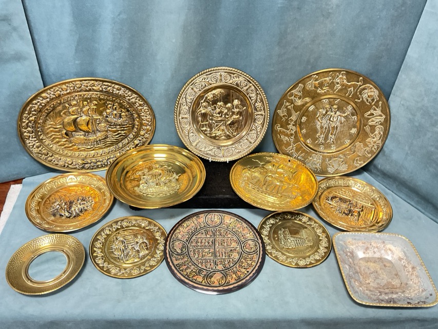 Eleven miscellaneous brass embossed plaques - pairs, alehouse scenes, ships, mirrored, Gemini, etc; and a pair of Egyptian copper neilo circular wall plaques. (13)