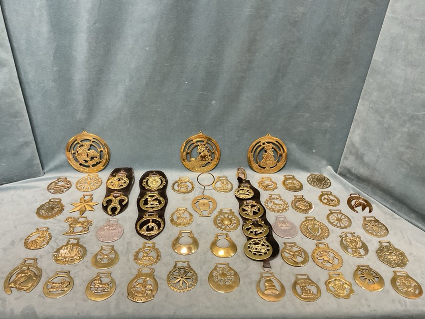 A collection of horse brasses - some old, military, some named, some attached to leather, RSPCA , etc. (55)