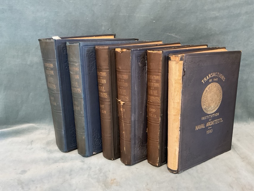 Six volumes of the Transactions of the Institution of Naval Architects, 1901, 1902, 1907, 1908, 1909, and 1910, with gilt tooled embossed cloth bindings. (6)
