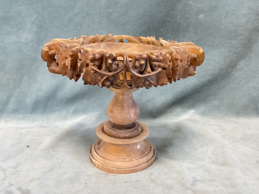 A C19th Italian alabaster tazza, the bowl carved in high relief with entwined vines on a baluster column and turned socle base. (12in x 10in x 9.5in)