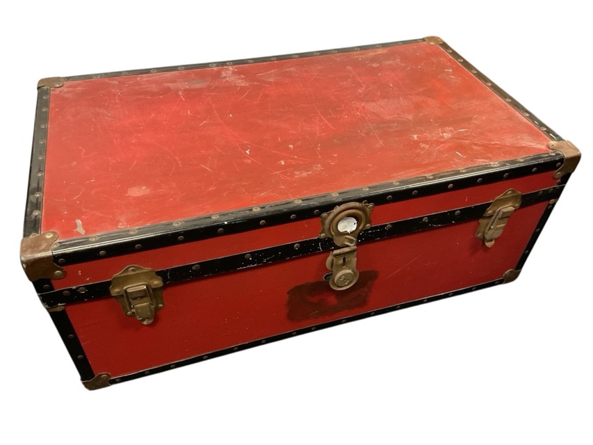 A large red trunk with brass mounts and studding, leather handles and lined interior. (36in x 20in x 14in)