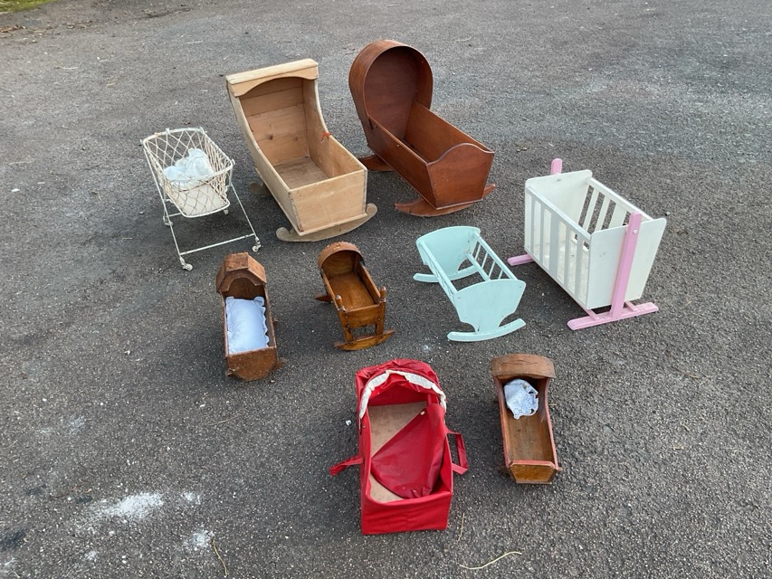 A collection of children’s cradles - a pine with arched headboard and dovetailed body; and another with panelled cover; scratch built cradles raised on shaped rockers; a swinging cot between trestle supports; and a faux leather Luxiproduct carrier with handles. (8)