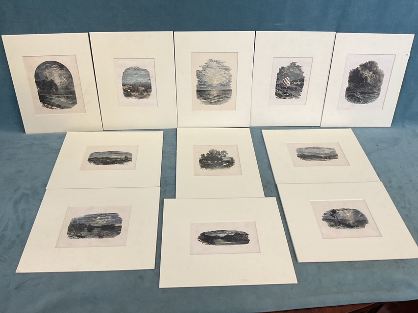 Eleven hand-tinted steel engravings after Miles Birket Foster - mainly moonlit landscapes and seascapes including Chinese and Turkish scenes, a storm at sea, lakes, a view of Eton College, fisherfolk on a beach, etc., signed or initialled in the prints, mounted. (11)