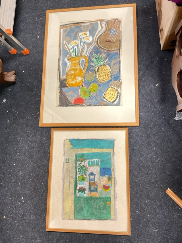 Ingebjørg Smith, collage with charcoal, paint, brown paper & textiles, titled Pineapple and Guitar to gallery label verso, mounted & framed; and another by the same hand titled Greek Scene, laid down & framed. (2)