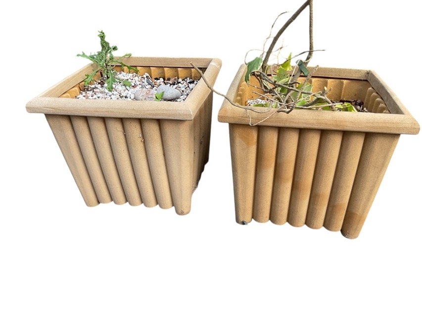 A pair of square plastic garden tubs of tapering ribbed form with moulded rims. (17in x 14.5in) (2)