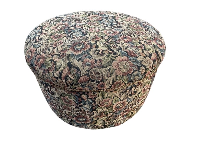 A floral tapestry fabric upholstered pouffe with circular cushion seat and tapering base.