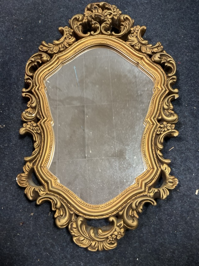 A Georgian style gilded plaster framed mirror with shaped plate bordered by pierced floral scrolling, with conforming scrolled crest. (17in x 28in)