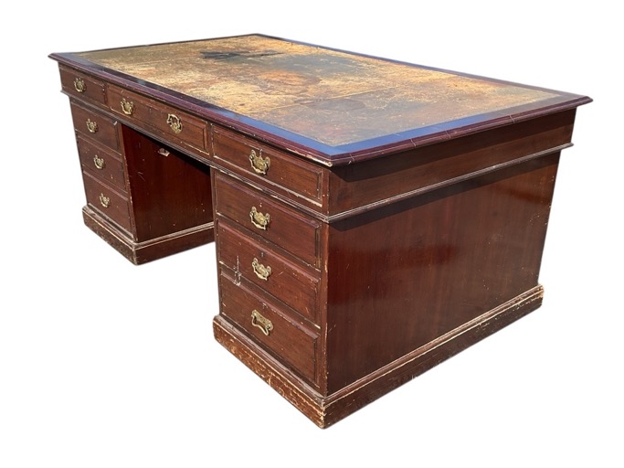An Edwardian mahogany partners desk with rectangular top set with gilt tooled leather skiver, above eighteen brass handled drawers supported on twin pedestals, above moulded plinths. (72in x 42in x 30.5)