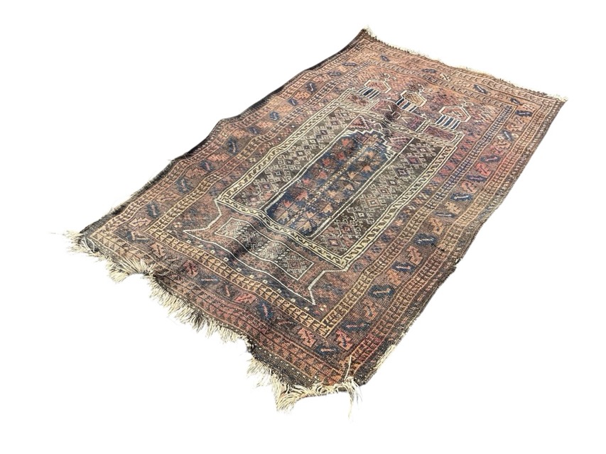 A Baluch wool prayer rug woven with rows of flowerheads on a red field within a mihrab and meandering foliate scrolled borders. (36.5in x 56in)