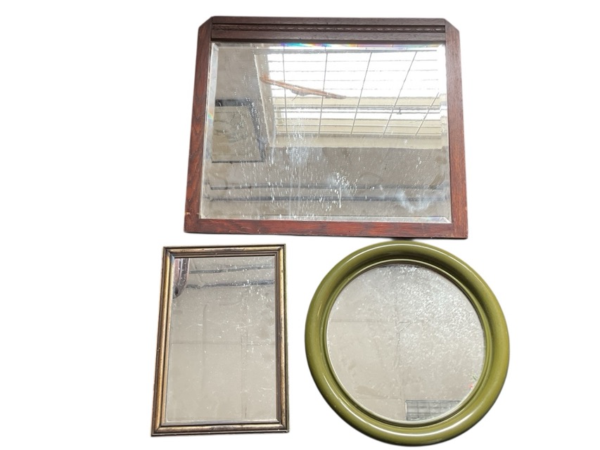 Three miscellaneous mirrors - rectangular in moulded gilt frame, circular in modern frame, and bevelled plate in carved oak frame. (3)
