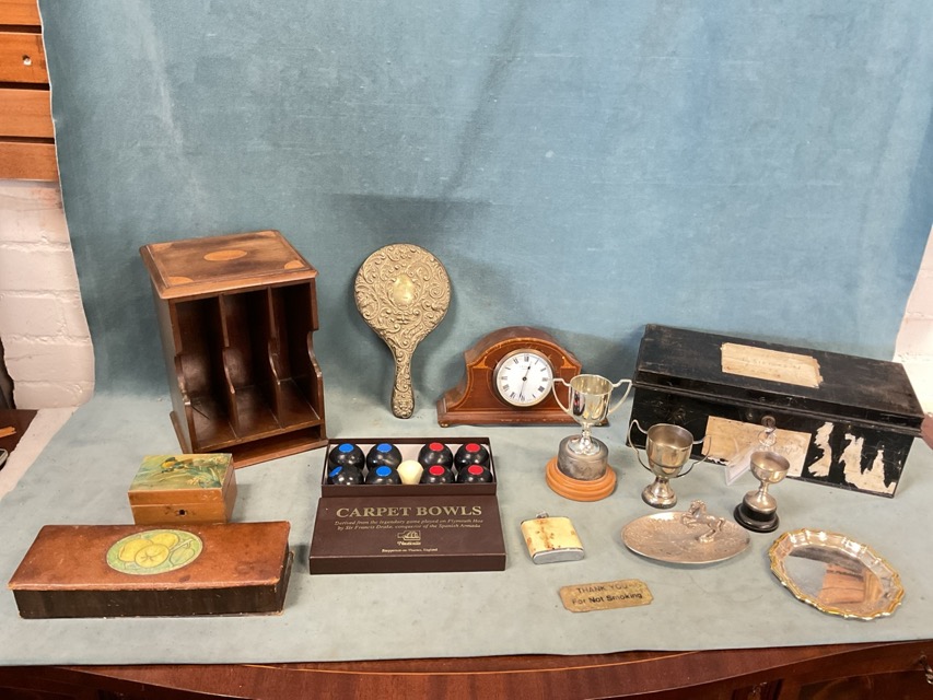 Miscellaneous items - an Edwardian mahogany inlaid stationary rack, trophies, a tin box, an Edwardian inlaid mantel clock, a foliate scrolled embossed dressing table mirror, a flask, a carpet bowls set, etc. (A lot)