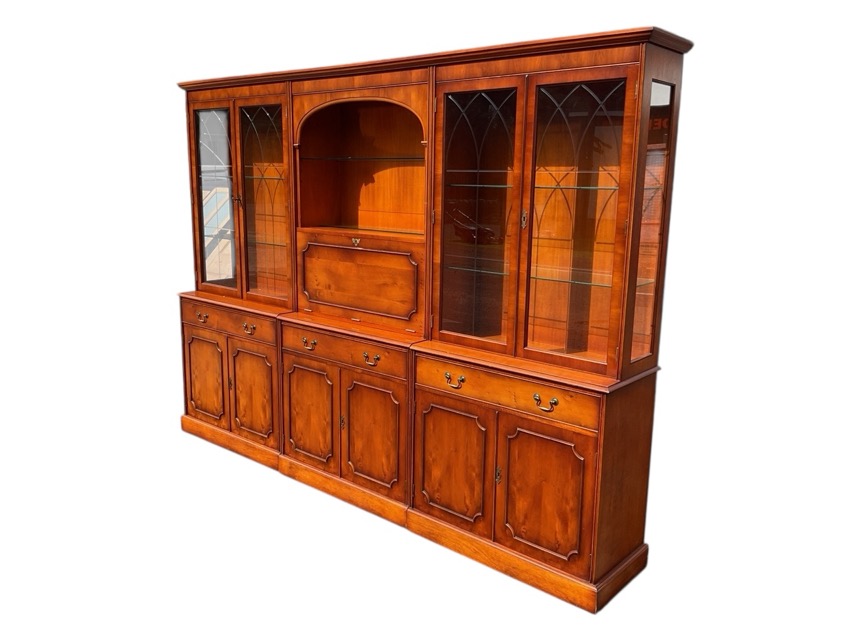 A Georgian style yew cabinet with moulded cornice above an arched open shelf and fall-front cocktail cabinet flanked by glazed display cabinets, on a base with brass handled drawers and doors on a plinth. (106in x 17in x 77in)
