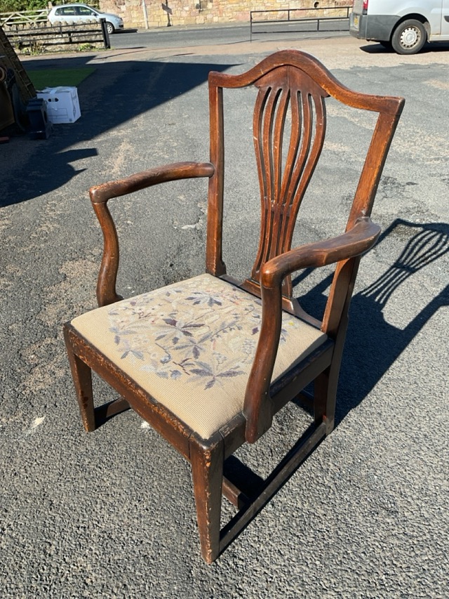 A Georgian mahogany Hepplewhite style armchair with arched back and pierced shaped splat above a drop-in upholstered seat, raised on tapering square legs joined by stretchers.