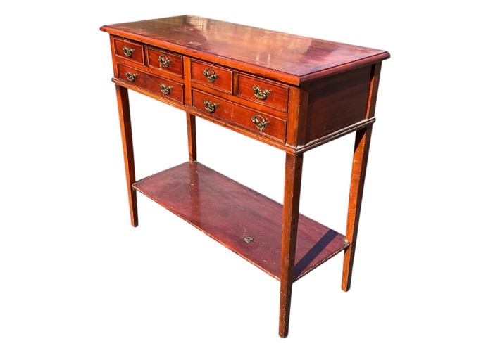 A Georgian style side table with rectangular crossbanded chequer strung top above six brass handled cockbeaded drawers, raised on square tapering legs joined by an undershelf. (32in x 13.5in x 29.5in)