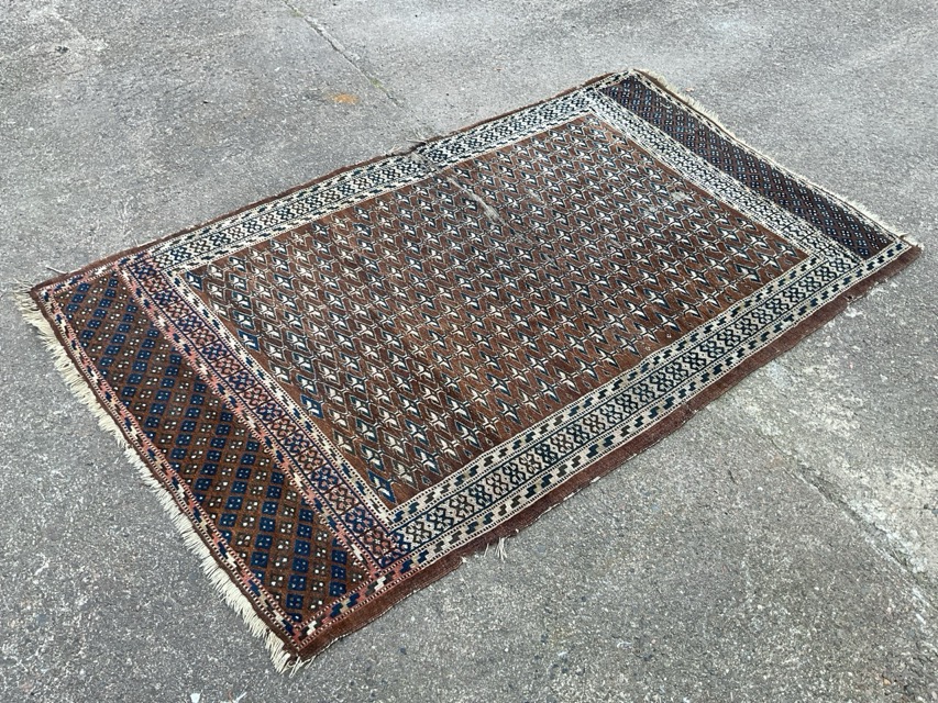 A Baluchi wool rug woven with a dense geometric vase field on chocolate ground, within multiple geometric borders. (48in x 80in)