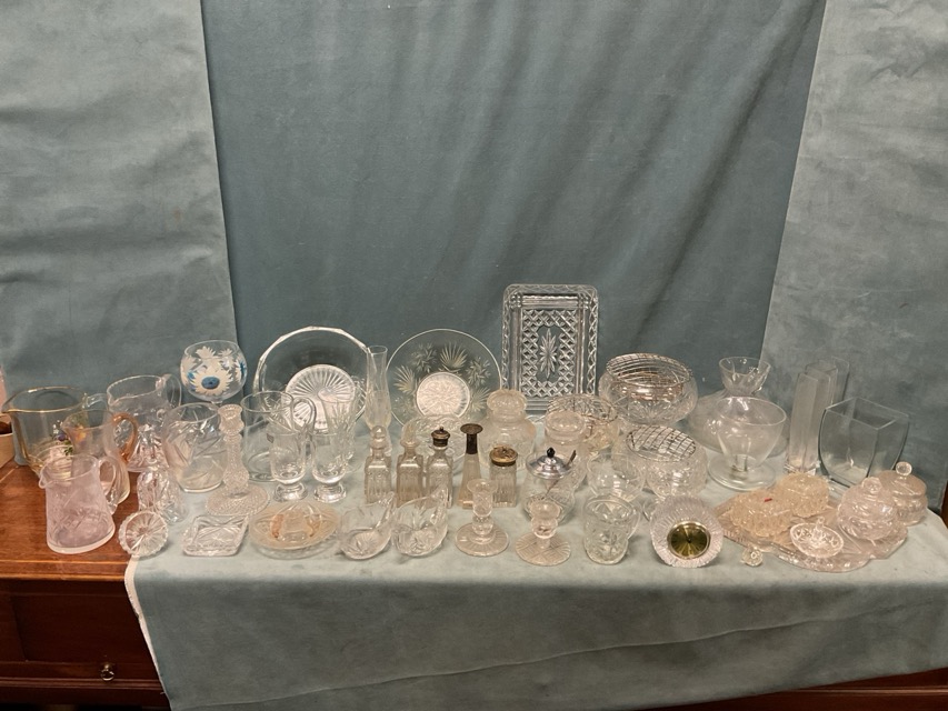 Miscellaneous glass - bowls, jugs, candlesticks, dressing table trays, vases, a bell, cut & moulded, cruet jars & stoppers - some with silver plated mounts, a clock, dessert bowls, a pair of boxed Denby glasses, etc. (A lot)