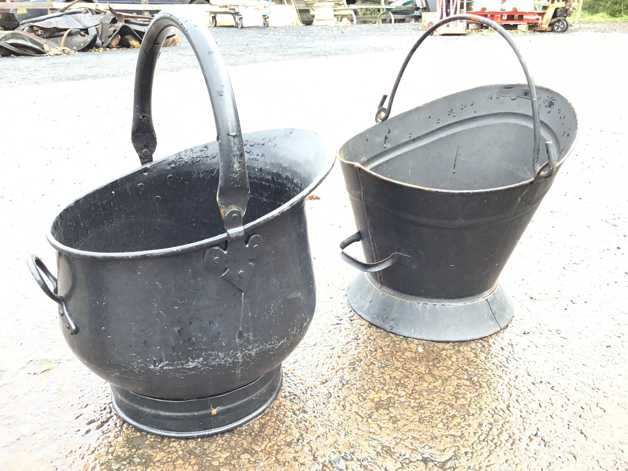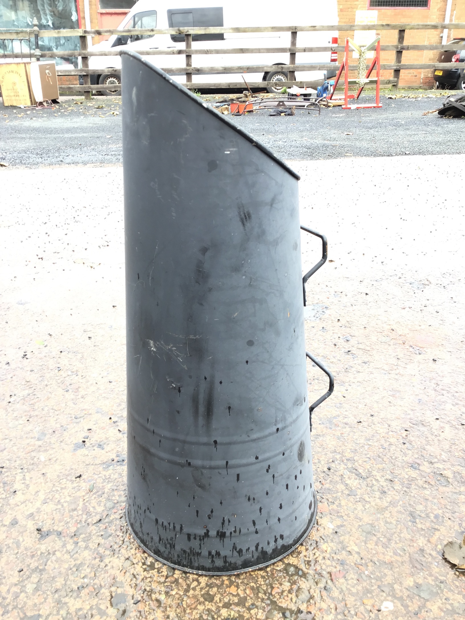 Two painted helmet shaped coal scuttles with rolled rims & swing handles; and a tapering ribbed coal shoot with twin handles. (3)