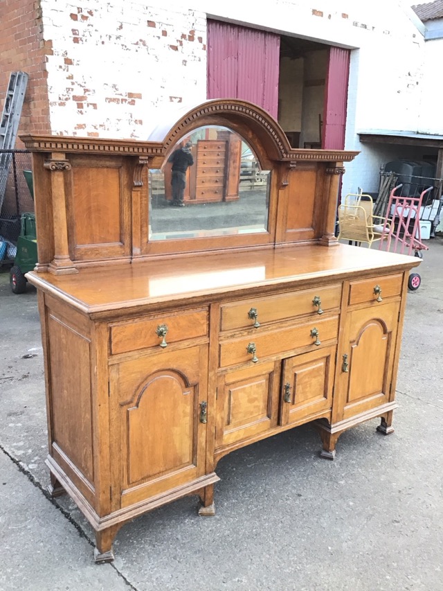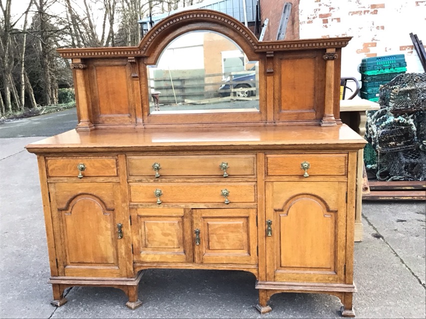 An Edwardian oak sideboard, the back with arched dentil cornice above bevelled mirror flanked by corbelled pilasters, moulded panels and ionic columns, the base with three frieze drawers over a further central drawer and fielded panelled cupboards, on moulded bases with square legs. (72in x 24in x 67.5in)