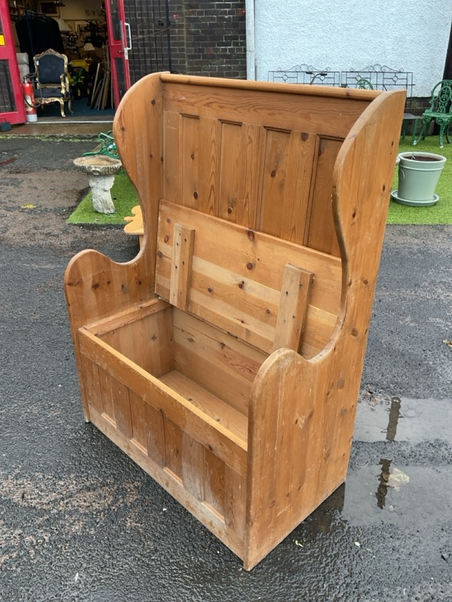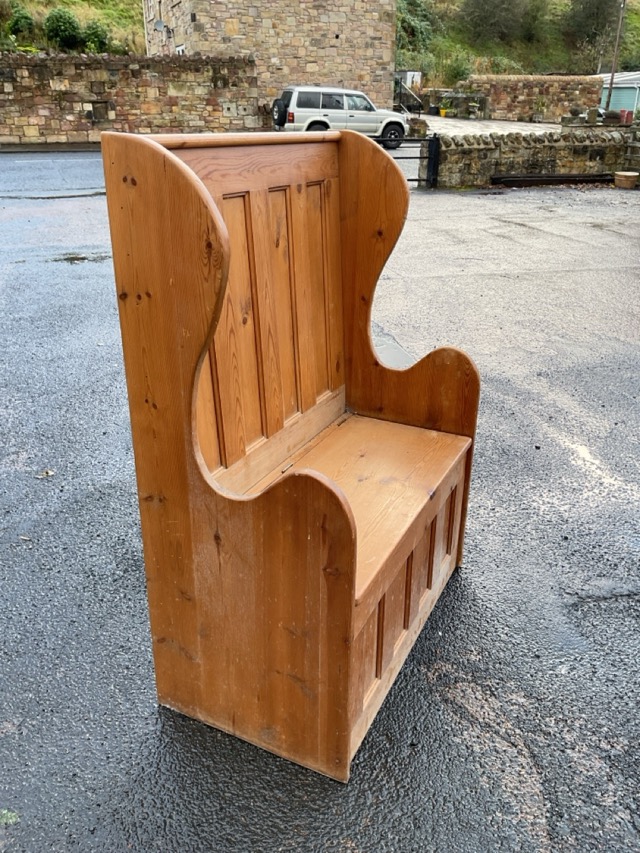 A pine settle with panelled back above a hinged box seat, framed by shaped arms and wings. (34.5in x 18.75in x 48.25in)