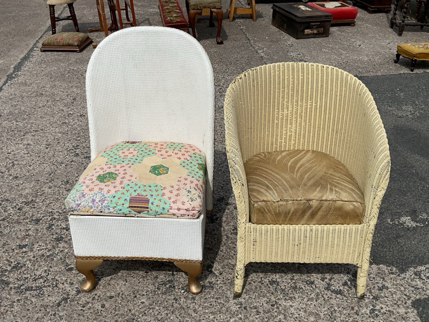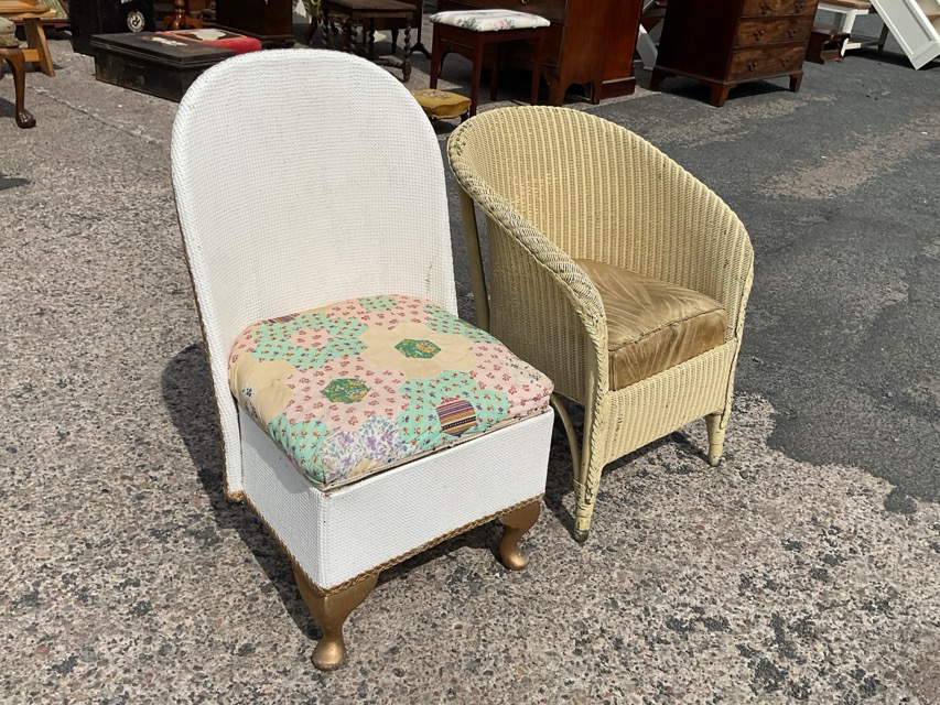 A painted Lloyd Loom style armchair with arched back and sprung upholstered drop-in seat raised on turned legs with brass cappings; and another cane arched back chair with patchwork upholstered box seat raised on stub legs. (2)