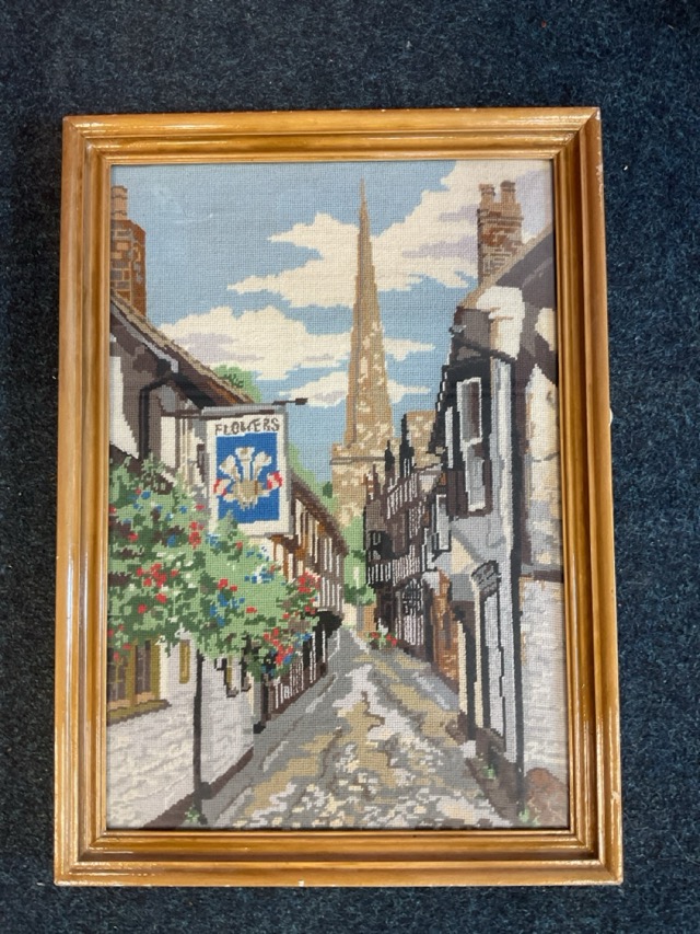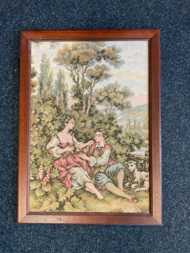 A woolwork tapestry panel depicting pub in narrow street overlooked by church, in gilt frame; and a tapestry of courting couple in bucolic landscape, framed. (2)