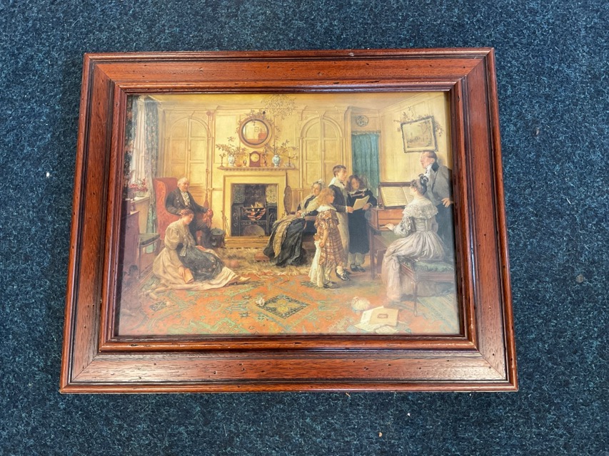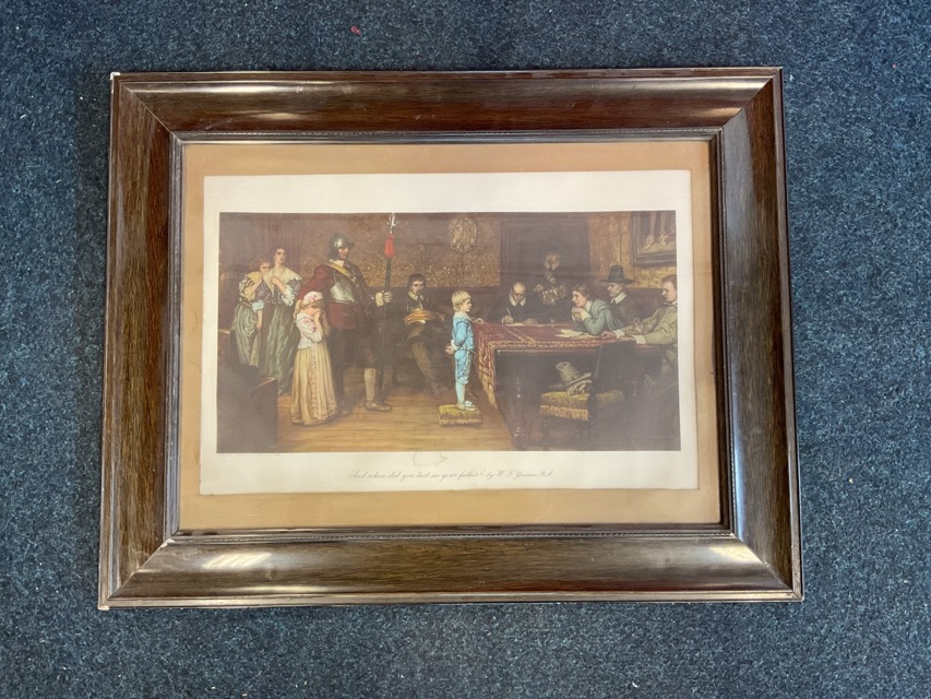 W.F Yeames, coloured print, When Did You Last See Your Father, mounted and framed; and a coloured print, depicting Victorian family in the parlour, framed. (2)