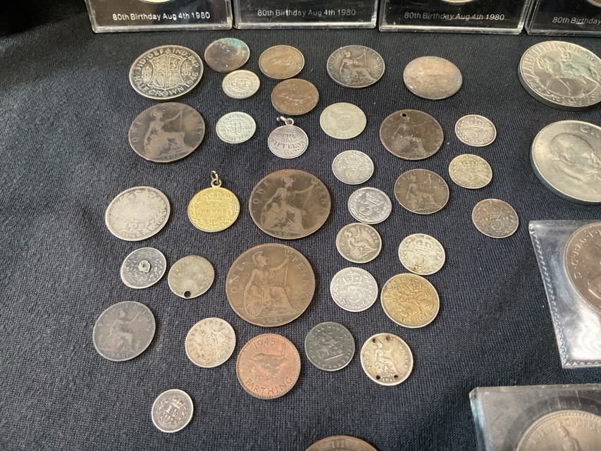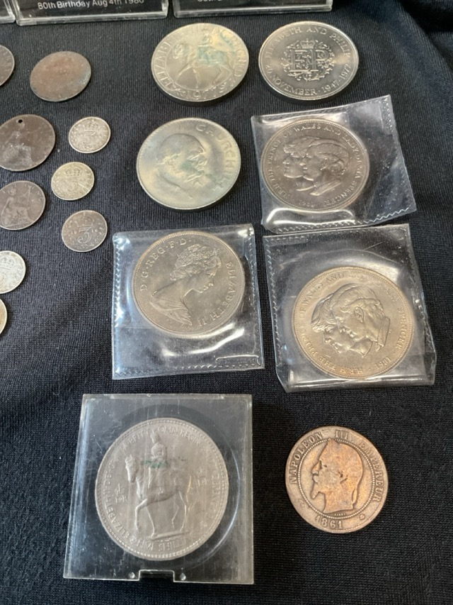 Miscellaneous coins - a William IV 1 and a 1/2d, pennies, farthings, silver threpence, commemorative crowns, Australian, lucky sixpence, many Victorian, a Napoleon III dix centimes, etc. (46)