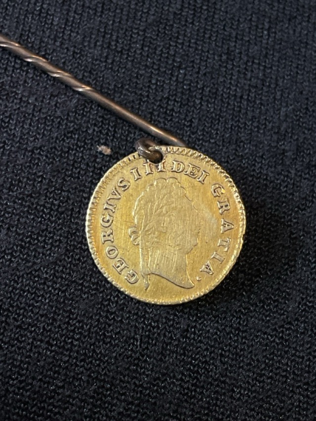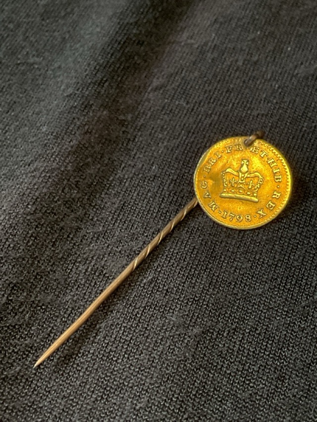 A George III 22ct gold 1/3 guinea coin, struck with the kings head & crown, dated 1798, mounted on gilt stick pin. (Approx 2g gold)