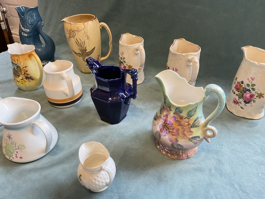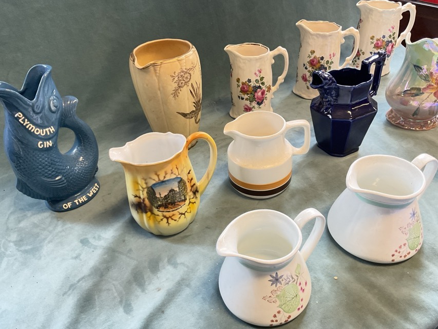 A collection of ceramic jugs - a Dartmouth Plymouth Gin glug-glug, a Beswick floral lustre, a Victorian octagonal, floral, Burleigh, Carrigaline, Arthur Wood, etc. (12)