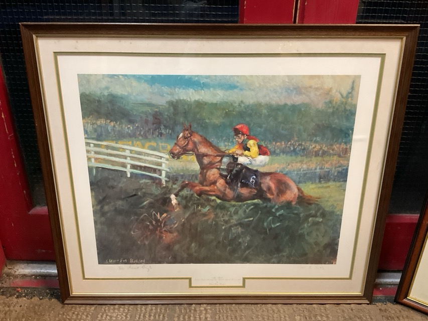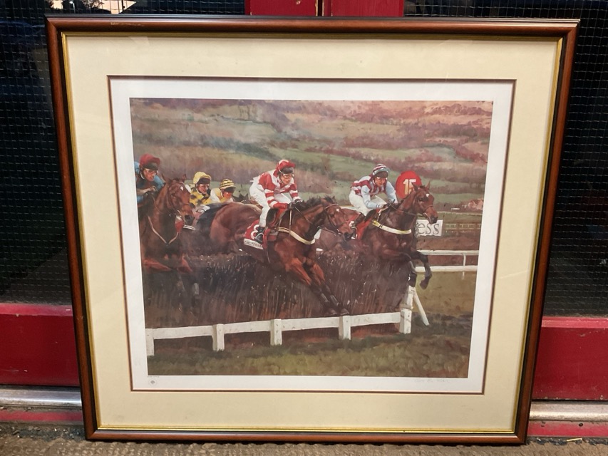 Claire Eva Burton, lithographic Chelsea Green horse racing print, signed & numbered in pencil on margin, titled Mr Frisk, mounted & framed; and another by the same hand with Cheltenham steeplechasers, signed & numbered in pencil, mounted & framed. (21in x 18in) (2)