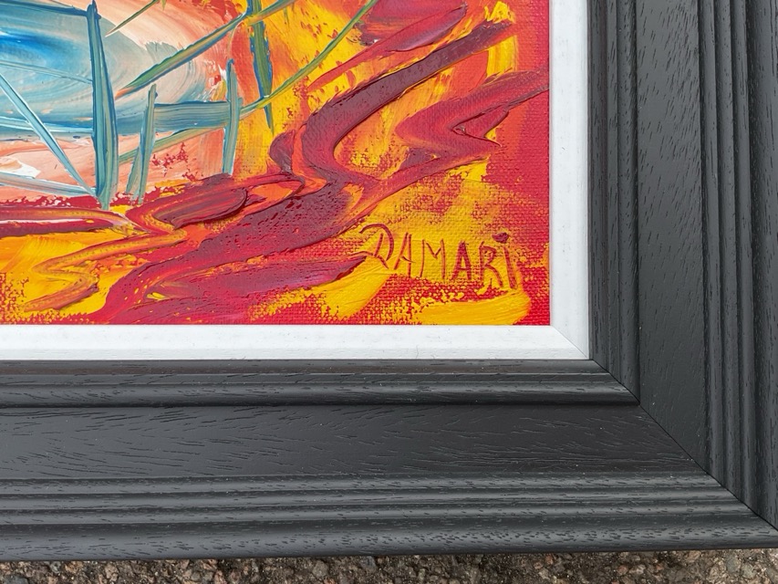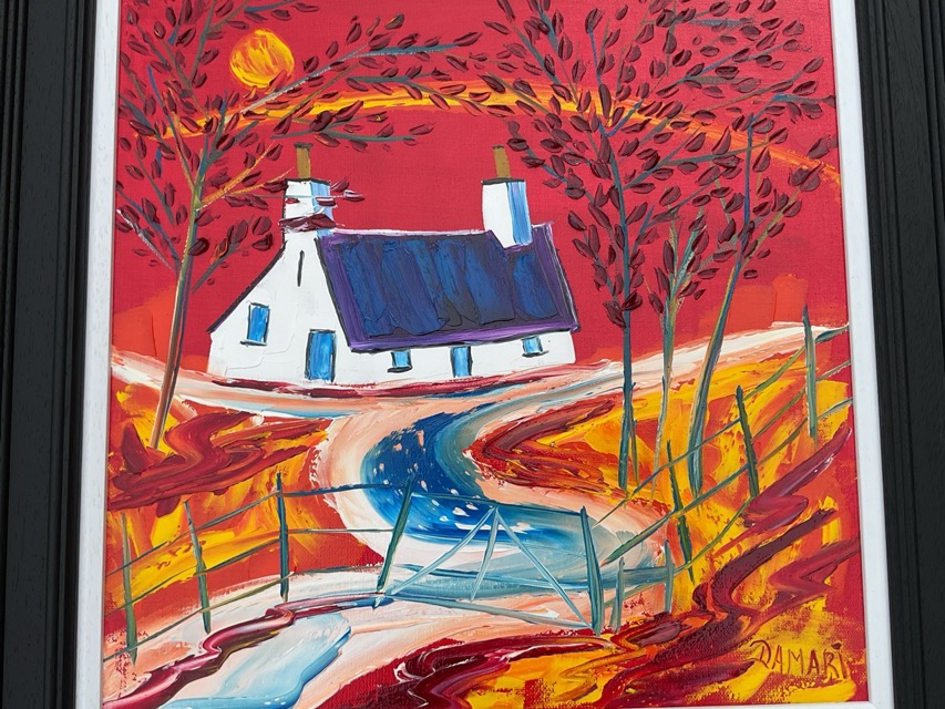 John Damari, oil on canvas, cottage through trees and fence under red sky, titled to verso Iona Croft In The Woods Argyll, in ribbed ebonised frame. (15in x 15in)