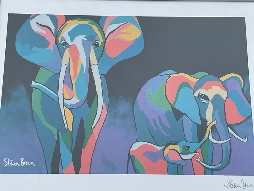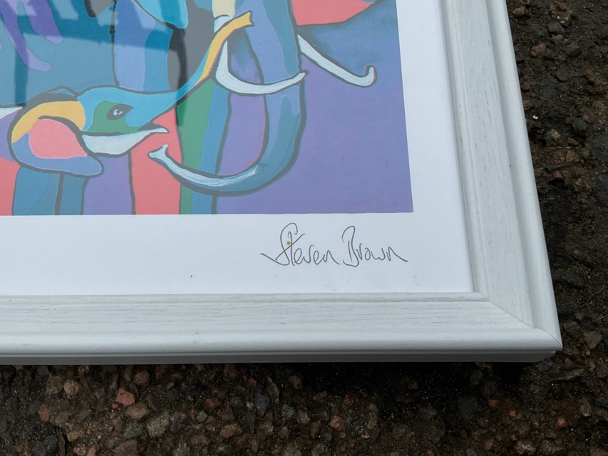 Steven Brown, contemporary coloured lithograph of elephants, signed in print and on margin, framed. (14in x 9in)