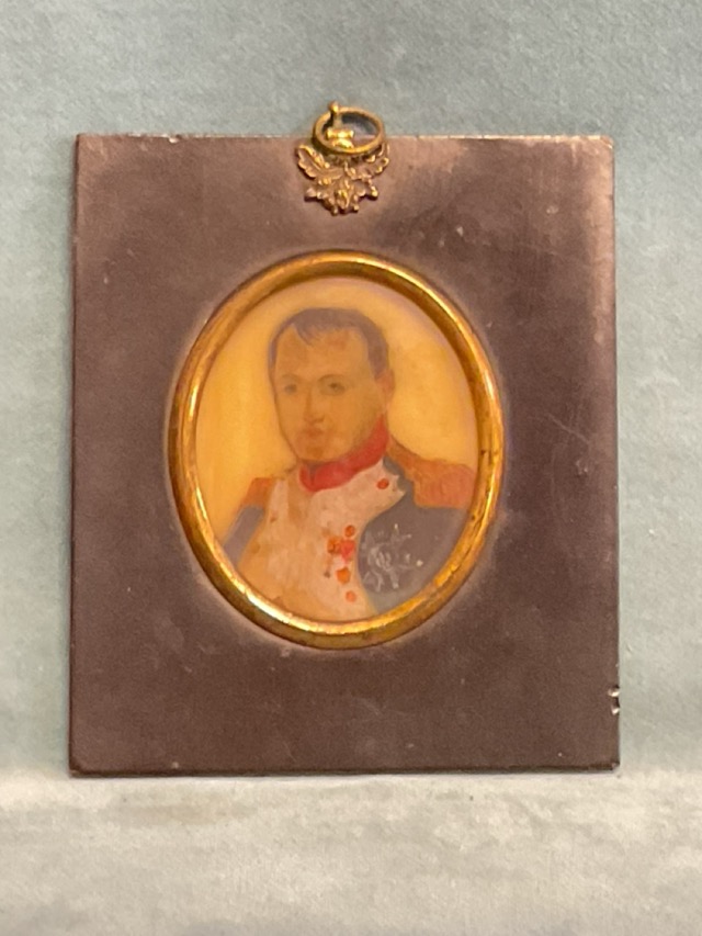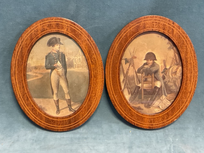 A C19th oval miniature watercolour bust portrait of Napoleon in ebonised frame with gilt brass bezel and oak leaf suspension ring; and a pair of oval boxwood strung mahogany framed handcoloured stipple engravings of Napoleon. (3)