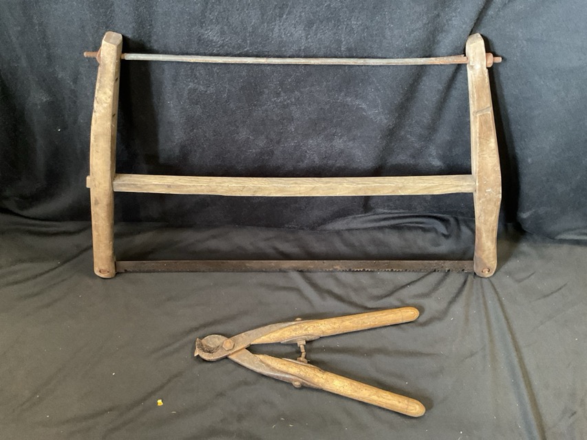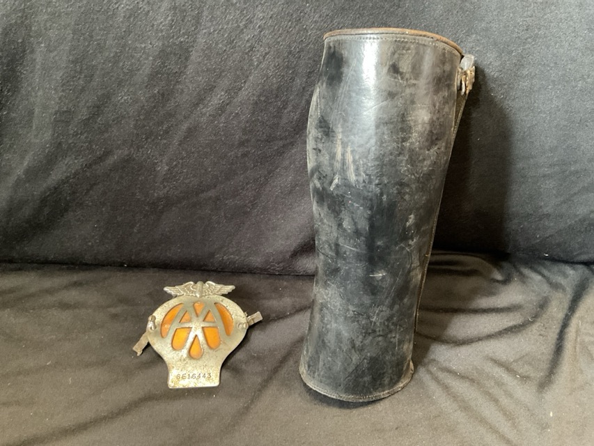 Miscellaneous items - an antique saw, wood handled blacksmiths shears, a leather gaiter, a pair of haines, and an AA car badge. (5)