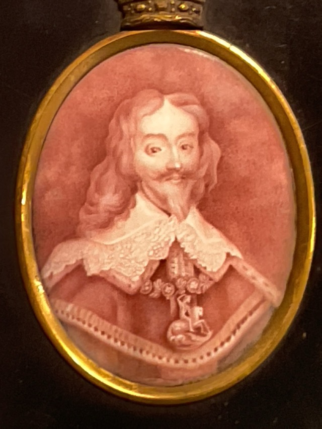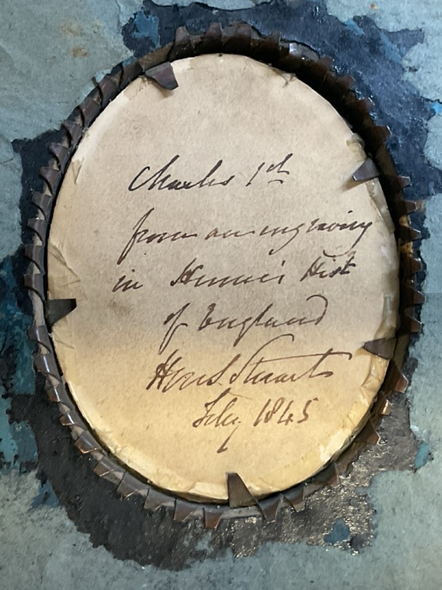 A Victorian oval miniature sanguine watercolour portrait of Charles I after Van Dyck, in an ebonised frame with gilt bezel surmounted by an embossed crown, inscribed and dated July 1845 to verso. (4in x 3in)