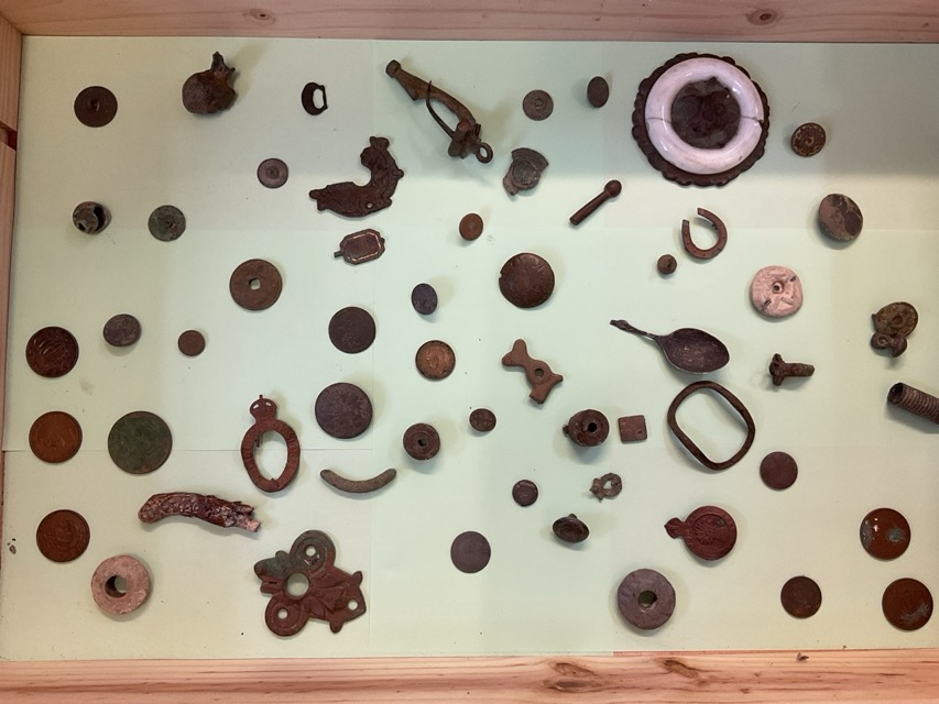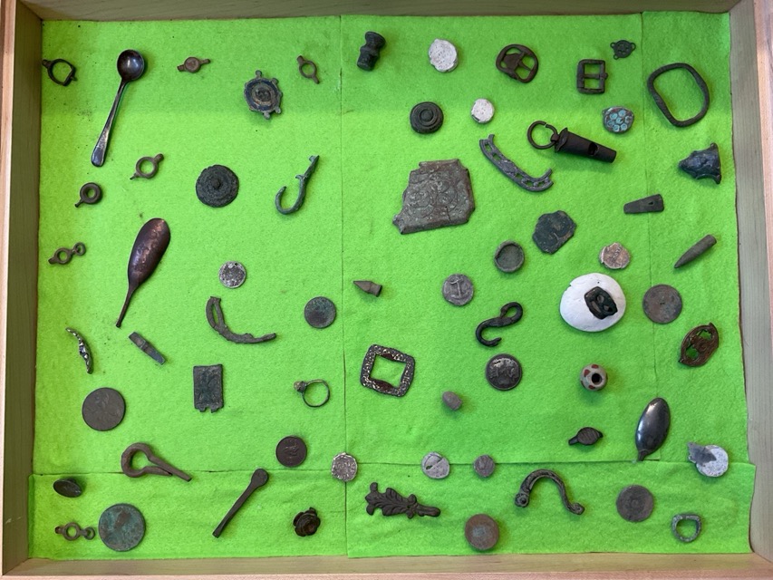 A collection of metal detector archeological “finds” - a late medieval ring, Roman brooches, coins, bullets, buckles, a Georgian intaglio ring, old spoons, belt fastenings, watch keys, fragments, buttons, badges, medallions, etc. (124 pieces)