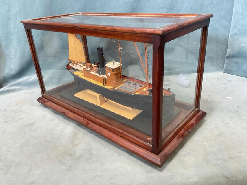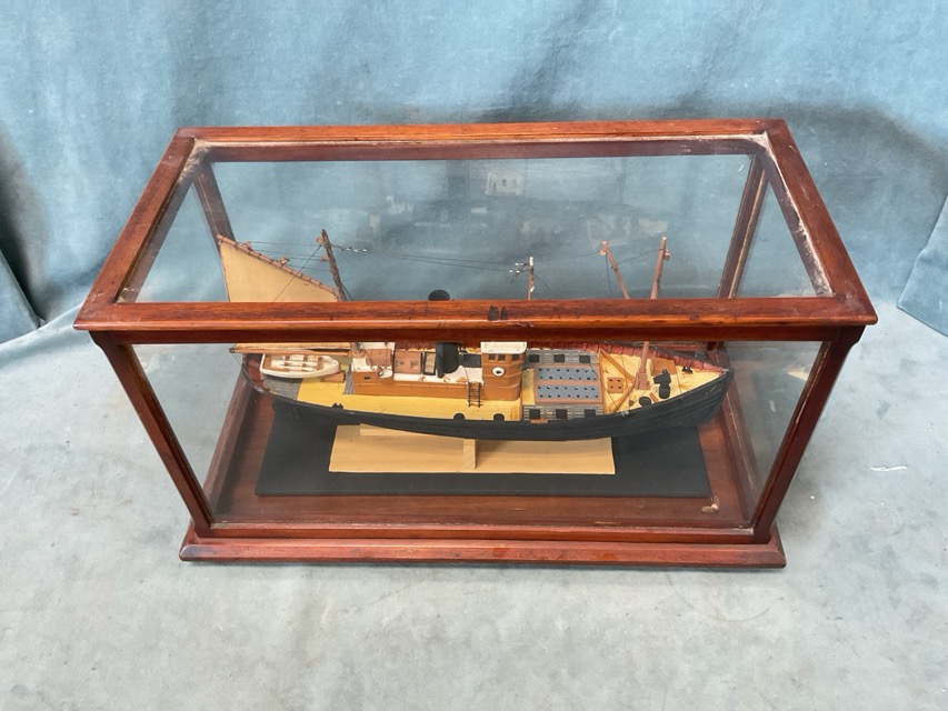 A scratch-built model of a North Sea steam trawler with full rigging in a rectangular glazed mahogany case, raised on bun feet. (20in x 10in x 11.75in)