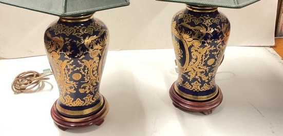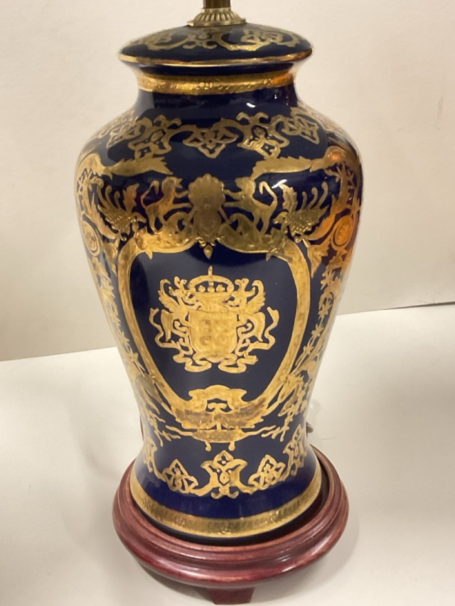 A pair of ceramic vase tablelamps decorated in gilt with coats of arms, scrolling foliage and interlaced borders on cobalt blue ground, raised on turned hardwood stands, with flared octagonal silk shades. (18in) (2)