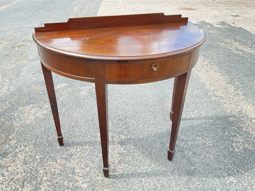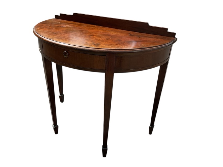 A mahogany hall table with stepped upstand and D-shaped moulded top above a frieze drawer, supported on square tapering legs with spade feet. (36.25in x 19.25in x 32in)