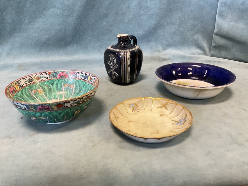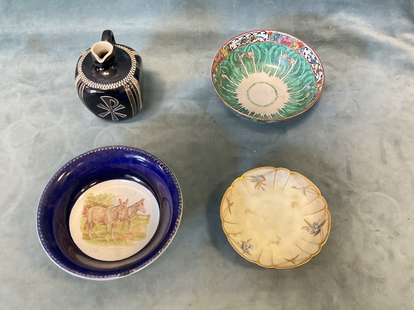 A German Westerwald stoneware jug with Chi-Rho sgraffito decoration; a Chinese porcelain handpainted Canton style cabbage leaf bowl; a Haviland Limoges aesthetic saucer dish; and a Staffordshire bowl with donkey decoration. (4)