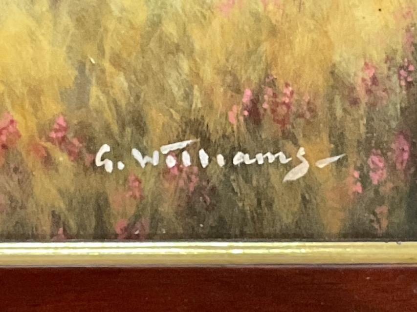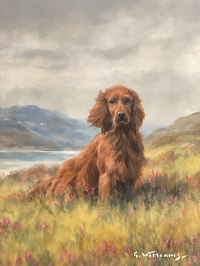 G Williams, oil on board, an Irish setter in a moorland landscape with distant loch, signed and framed. (5.5in x 7.75in)