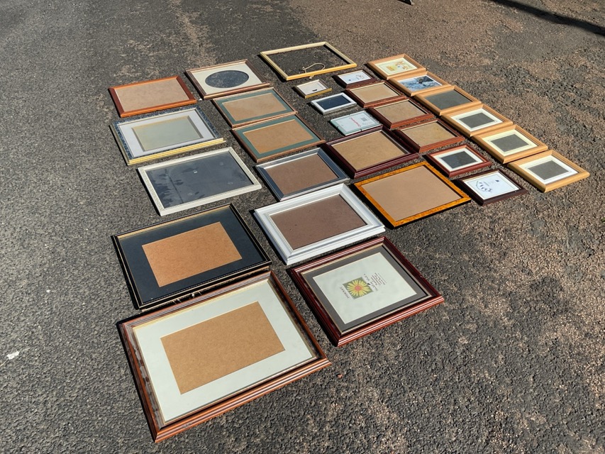 A box of miscellaneous picture and photograph frames, mahogany, oak and burr maple effect, painted, many with mounts and glass, etc. (29)