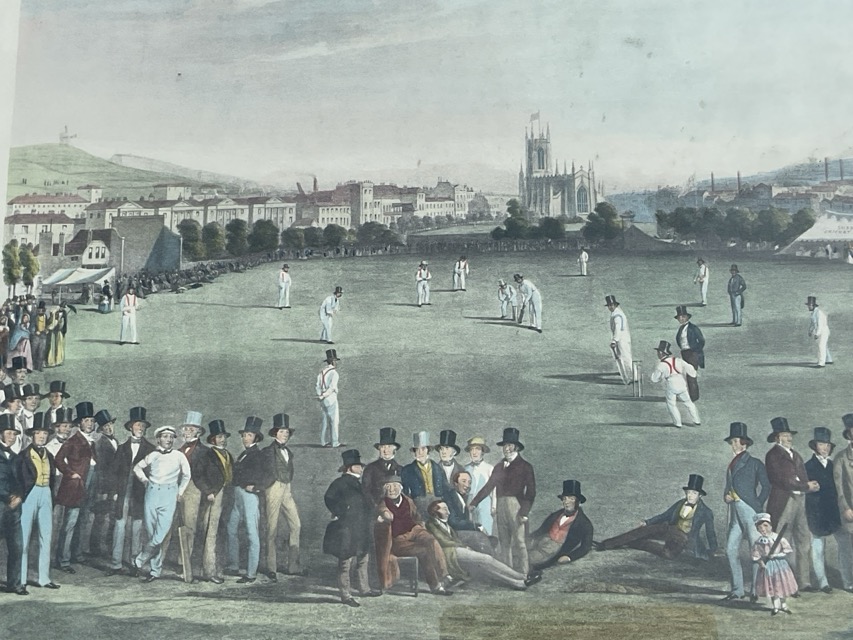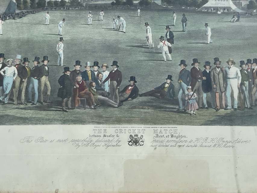 WH Mason, coloured print of nineteenth century Sussex v Kent cricket match in Brighton, the landscape plate with titles, framed. (29in x 22.5in)
