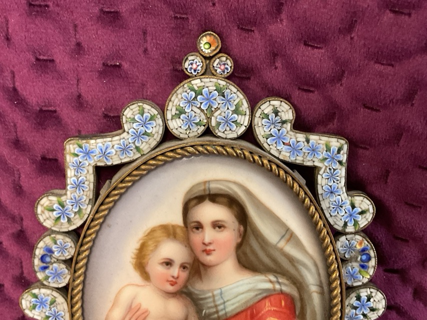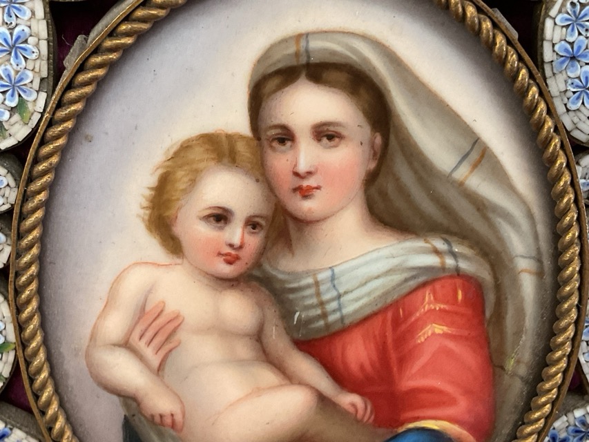 A nineteenth century oval European miniature on porcelain, mother & child after Raphael, in gilt ropetwist frame, with floral micromosaic mount/stand. (5.25in)
