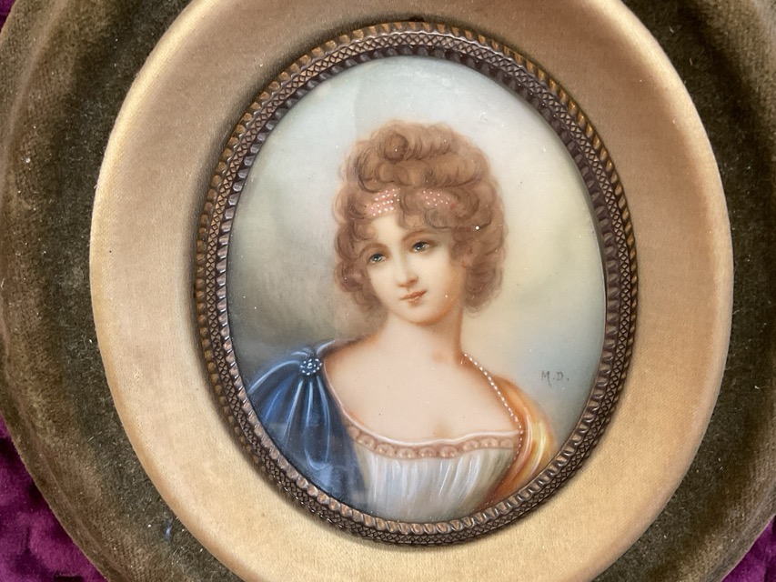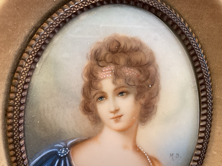 Miniature oil on panel, bust of a young lady with pearls, signed with initials MD, in velvet frame. (3.25in)