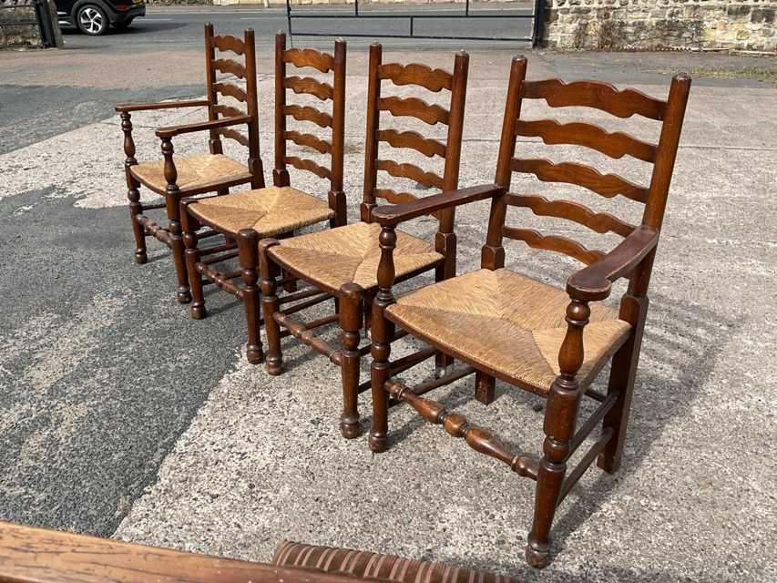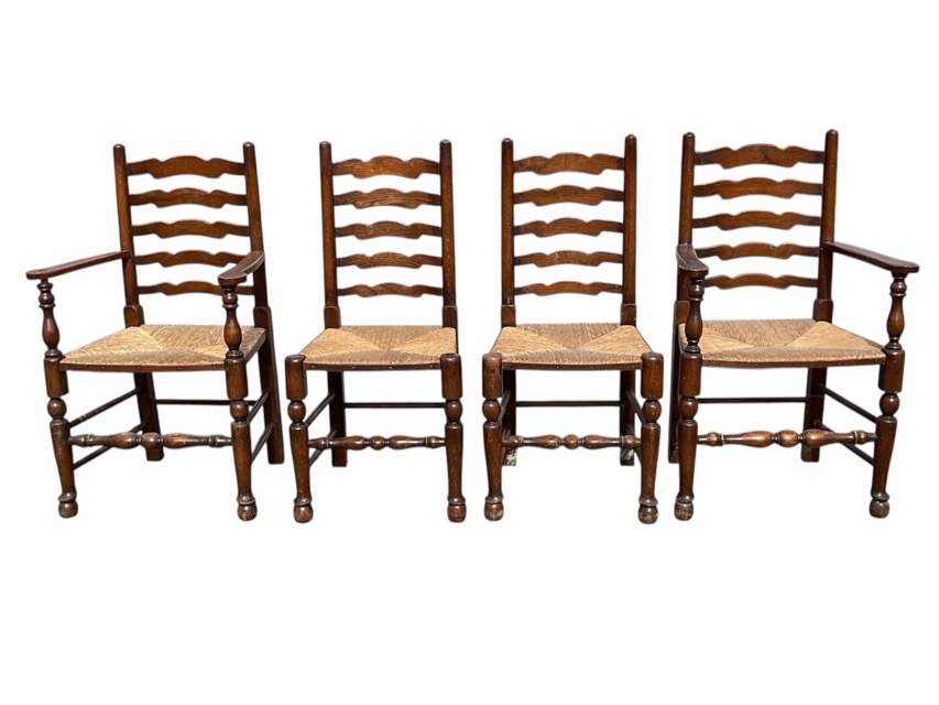 A set of four Georgian style country oak ladderback chairs including two carvers with shaped rails above rush seats, raised on turned legs and stretchers. (4)